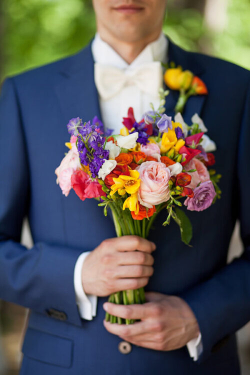 Most wedding bouquets already consist of an array of beautiful florals in different shades, but if you’re looking to show off your pride then opt for florals that are shades of red, yellow, blue, green, orange, or purple to represent the LGBTQ rainbow flag. Don’t feel forced to use every color, you can choose three colors that match well with your wedding theme. Since boutonnieres are smaller than bouquets, you may want to narrow it down to two shades of the rainbow.